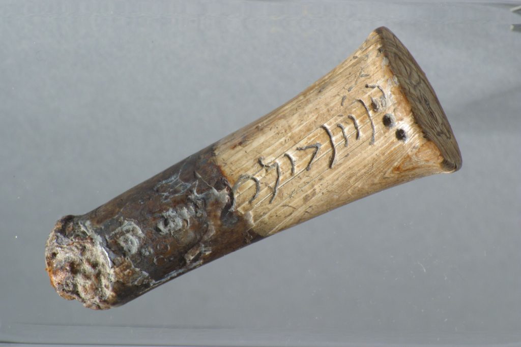 Zu verdanken ist des Rätsels Lösung der Hartnäckigkeit und der exzellenten fachlichen Vernetzung des Archäologen und Althistorikers Univ.-Prof. Dr. Stefan Pfahl (Heinrich-Heine-Universität Düsseldorf). Dieser erkannte die Besonderheit des Stückes und stellte den Kontakt mit dem emeri-tierten Indologen Univ.-Prof. Dr. Harry Falk (Freie Universität Berlin) her. Dieser Spezialist für altin-dische Sprachen entzifferte die Ritzinschrift als Khar, eine Variante der altindischen Schrift Kharosthi. Weiters fand er heraus, dass es sich bei diesem Objekt um ein Ehrengeschenk des Königs für einen Mann namens Tadara handelt. Es liegt daher nahe, dass das im Griff eingeritzte Gesicht den König darstellt.