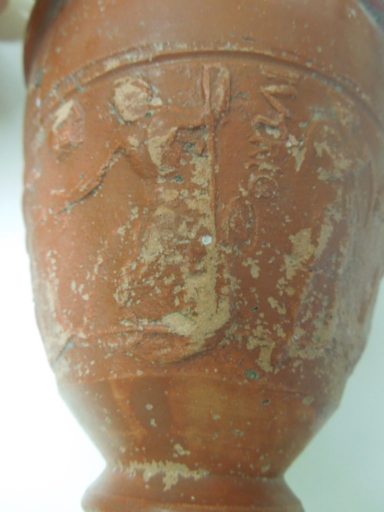 Keramik mit Glanztonüberzug und figürlichem Barbotinedekor, der zum Teil abgeplatzt ist. 2./3.Jh.