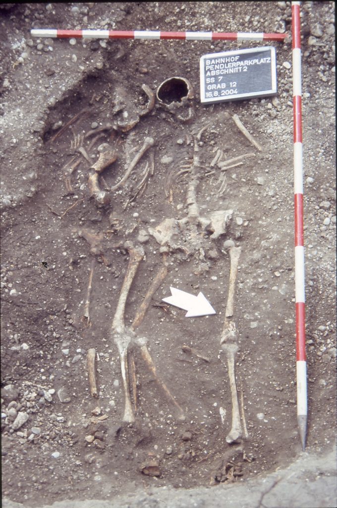 Bei Grab 12 handelt es sich um eine Bestattung zweier Individuen, die direkt über den Skelettresten eines Pferdes gefunden wurden.